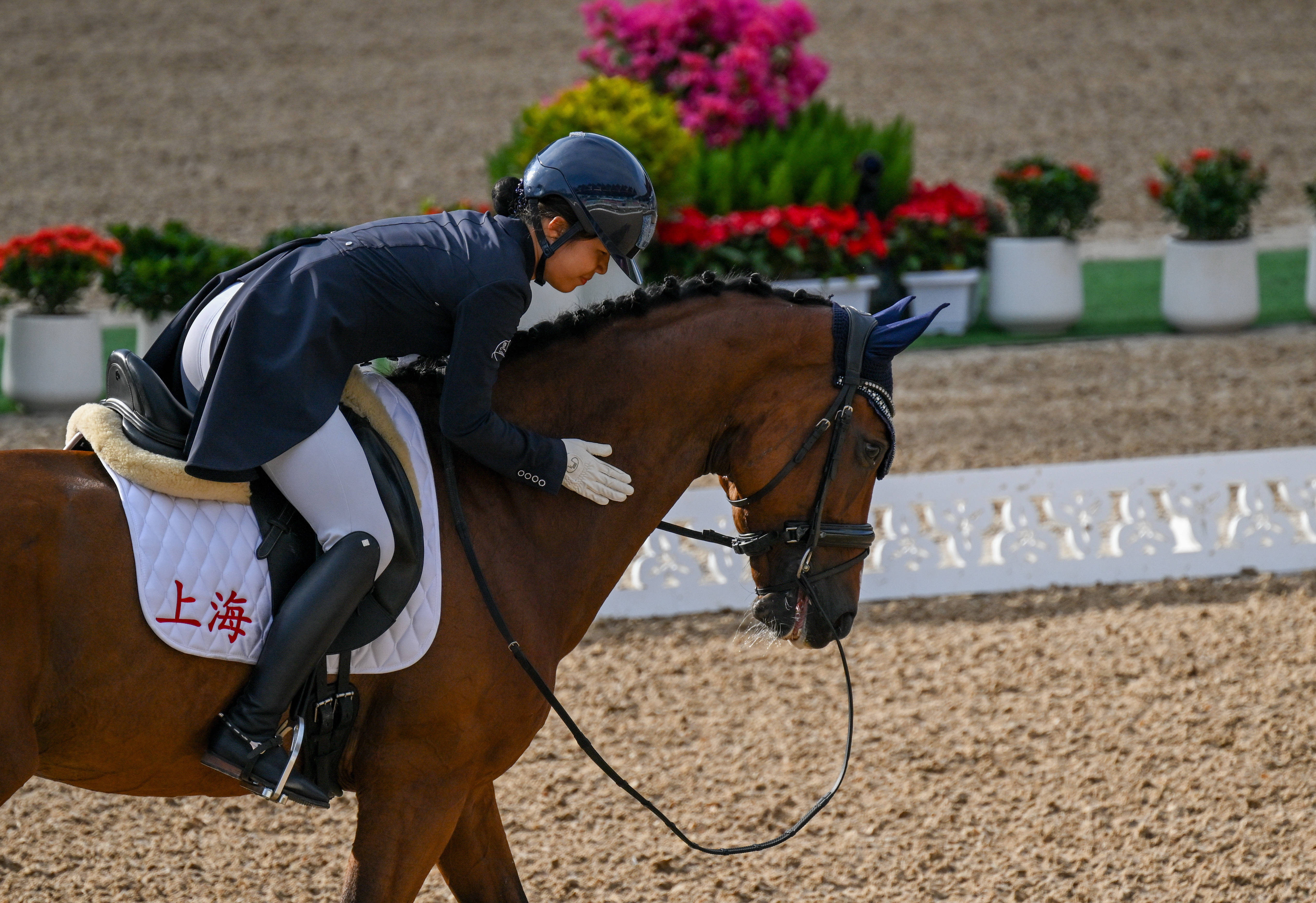 11月10日,上海队选手徐墨菲在比赛后轻拍她的马匹“好好”。新华社记者 连振 摄正因如此,在马术比赛的混合采访区,几乎每一位骑手都会首先提及马的表现。马虽无言,却是他们最重要的伙伴。